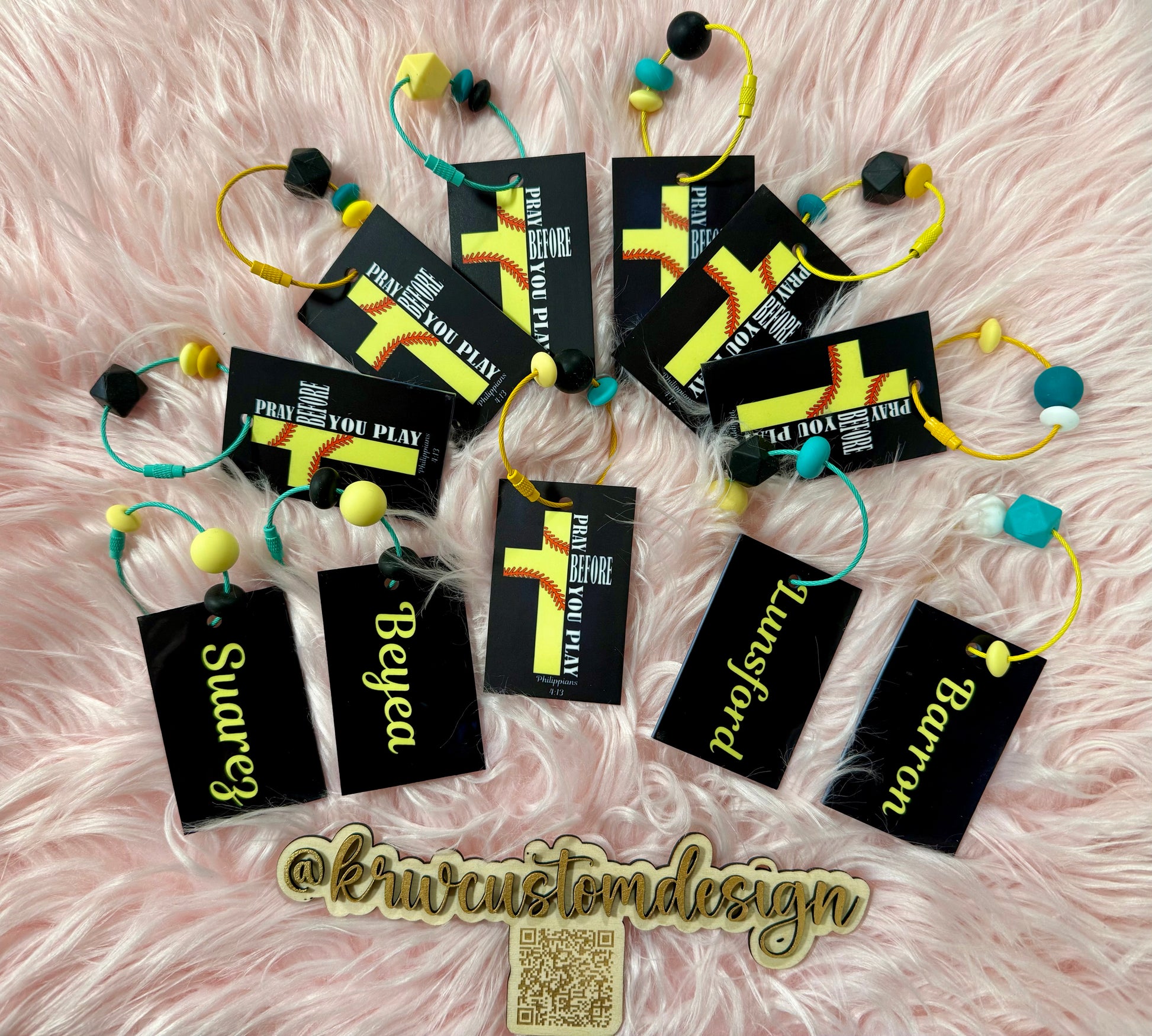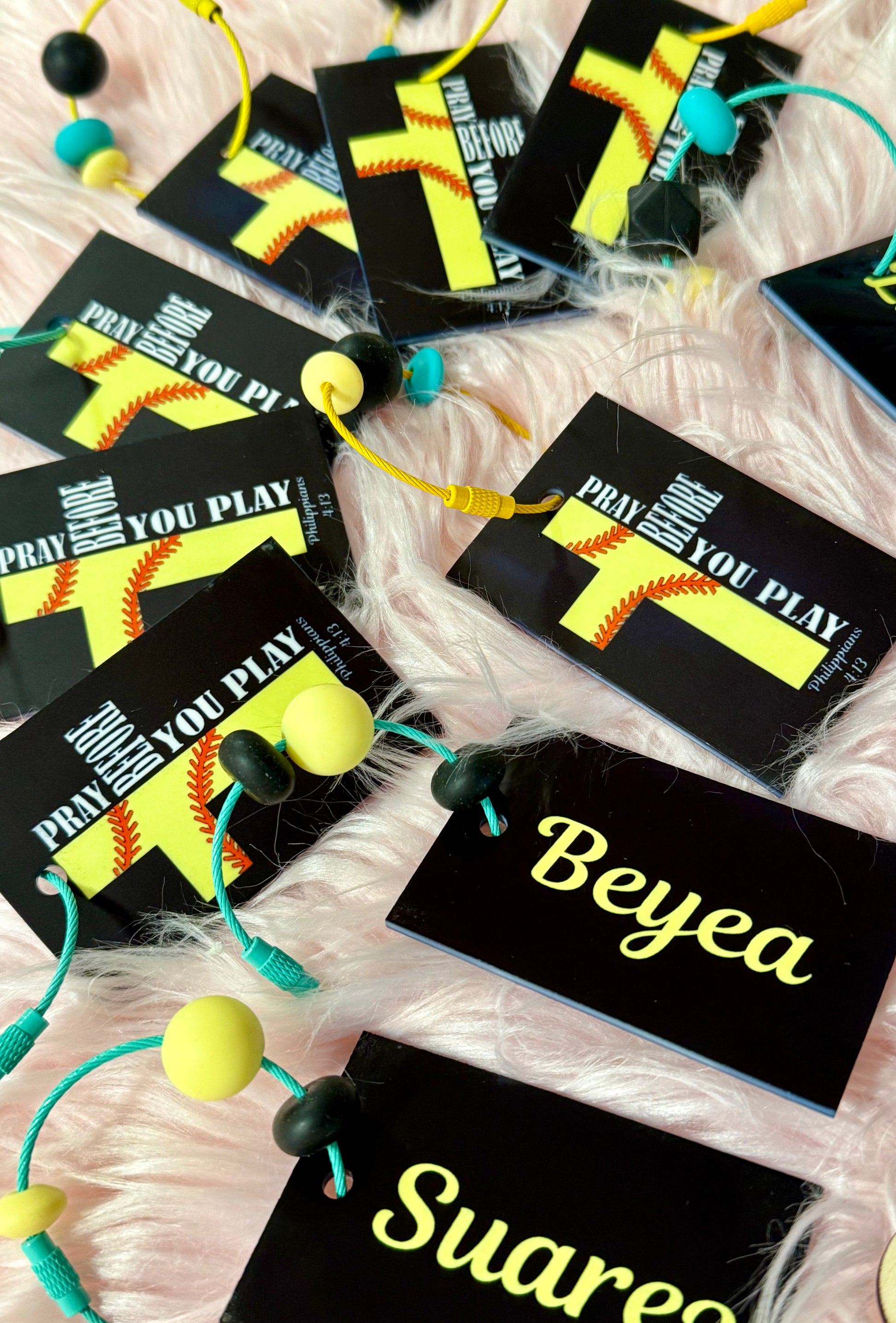 Elevate the game with our custom Softball Bag Tag! Show off your unique style with a personalized name tag made of durable acrylic. Its sturdy wire ring ensures it stays securely on your sports bag, so you can proudly represent your love for softball wherever you go.